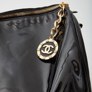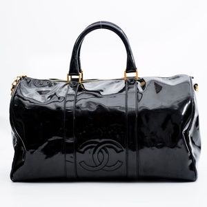 CHANEL VINTAGE BLACK PATENT CC DUFFLE BOSTON BAG (1996)