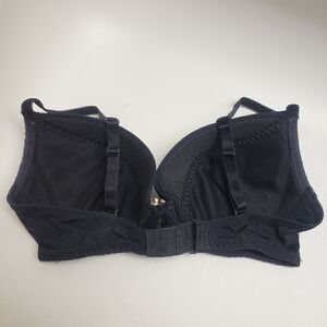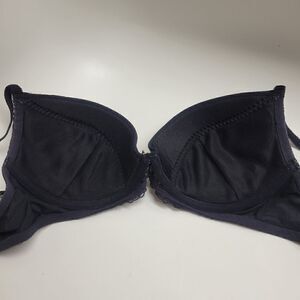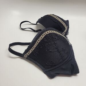 Nice black lightly padded bra with lace overlay and beige embroidery trim. Good used condition. Size 32E.