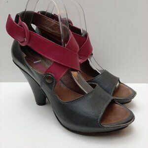 • Genuine leather chunky cone style heel open toe pumps with contrasting pink criss cross adjustable straps.