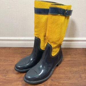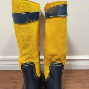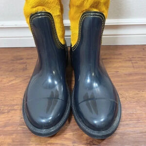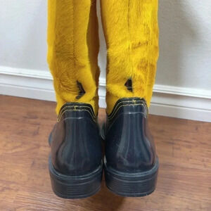 WHAT: Rain boot with yellow faux fur. Pull on style
