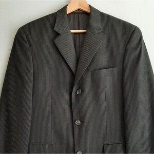 • Sophisticated and stylish three button closure blazer in black with thin white pin stripe pattern. Fully lined with notch lapel and no back vent.