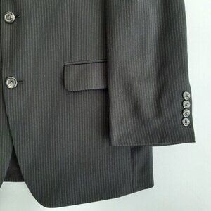 • Sophisticated and stylish three button closure blazer in black with thin white pin stripe pattern. Fully lined with notch lapel and no back vent.