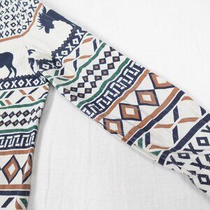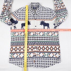 Nice quality thick 100% cotton shirt. Off white with southwestern colours and patterns and Moose motif. Great condition, no stains, no rips or holes, light wear, a few light crease fade lines on the arms - see last photo. Tag size Large - see measurements in photos.