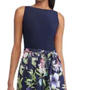 A solid jersey bodice and floral-print skirt give this stylish petite Chaps maxi dress the look of two pieces in one effortless ensemble. In navy, multi.