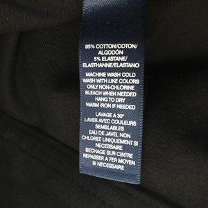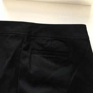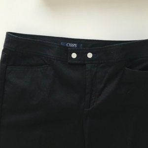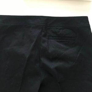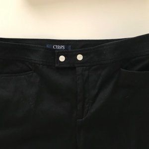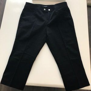 Black capris with zipper and 2 silver button front closure. Two front pockets and one rear pocket. Belt loops around the waist.