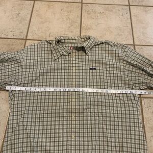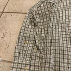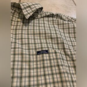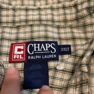 Classic and comfortable CHAPS long-sleeve plaid button-down shirt. Features a timeless green and white plaid pattern, perfect for a casual day out or layering. This shirt is a size 3XLT, made for a tall and comfortable fit. It's in pre-owned condition with a small mark on the left sleeve, as shown in the photos.