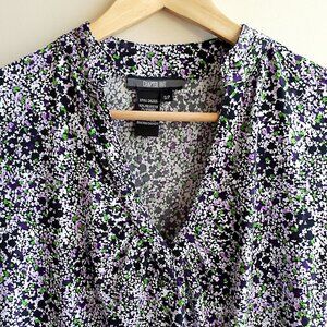 Pretty collarless v-neck short sleeve tee blouse with floral print from Chapter One. Print is a dense floral pattern with small blossoms in white violet purple and pink. Perfect for springtime. Fabric is a smooth cooling polyester with a comfortable stretch. Has rushing detail at the bottom of the neckline.