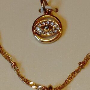 The charm necklace is ornate and comes with an evil eye charm.