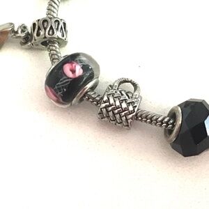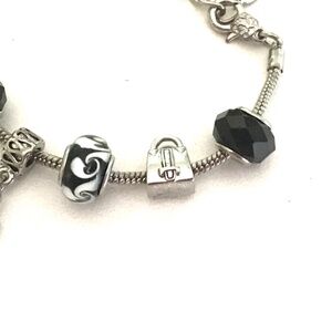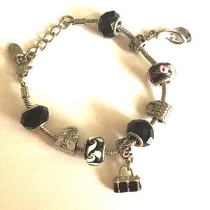 Pretty charm bracelet featuring 5 glass beads and 4 charms in the shape of a handbag and high-heeled sandal. Silver cable with lobster clasp closure. Black , white and pink. In perfect condition.