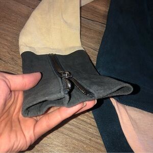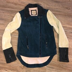 CHASER Suede Leather Blue Body Cream & Grey Cuff Sleeves Colour Block Moto Sz XS