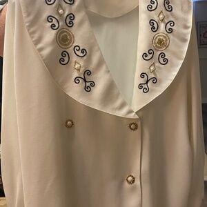 White semi-long sleeve blouse w vintage collar and black, gold and pearl embellishments.