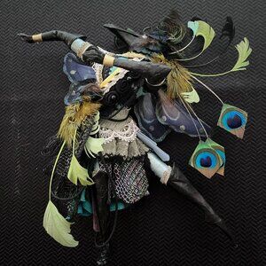 Nelson Daniels trained formally in London, Ontario, and began her career in Toronto’s film and animation industry. Her creative journey led her from crafting silk banners for North American retailers to designing figures for the National Ballet of Canada’s La Belle Époque. Her work has since graced the Stratford Shakespeare Festival, New Orleans Mardi Gras, Bermuda galleries, and Tiffany’s Boston store. A MockingBird was acquired by the Museum of American Folk Art in New York and later sold through the Mariposa Gallery to a private collector.Her pieces have been collected by luminaries such as John Candy, Karen Kain, Evelyn Hart, and Toller Cranston. Each figure is a spiritual and artistic exploration.“Wings of Reverie” is a dynamic, hand-sculpted figure adorned with authentic peacock feathers, iridescent wings, and layered textiles including lace, velvet, and metallic mesh. The pose evokes movement and ritual, while the costume suggests folklore, flight, and fantasy. The artist’s gold signature is embedded in the design, confirming its provenance.