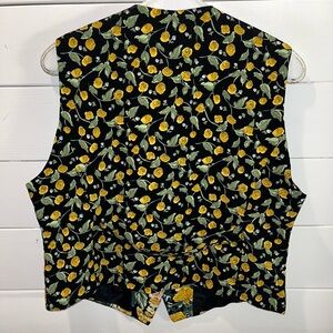 Vintage black floral vest with a vibrant yellow rose print. V-neck, button-down front, and decorative back strap with buttons. Lightly structured with two front pockets. A bold layering piece perfect for vintage lovers and cottagecore fans.