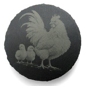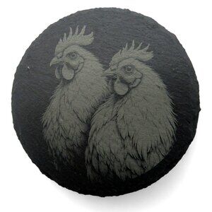 This charming set of 4 round slate coasters features intricately engraved chicken designs, capturing the essence of rustic farmhouse aesthetics.