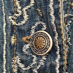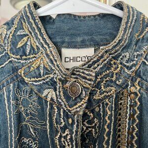 CHICO'S Denim Gold All Over Embroidered Sequinned Button Down Show Shirt Size 1