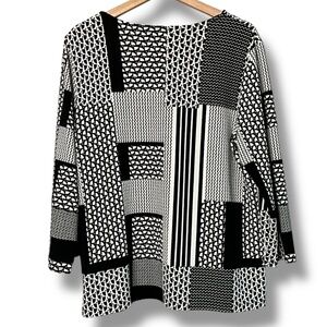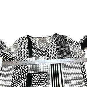 CHICO’S EASYWEAR Vee Neck Popover 3/4 Sleeve Top B&W Patchwork Print US Sz L