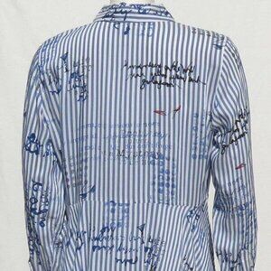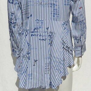Word around town is you love a good conversation. With its stripes and splashes of script, this long-sleeve button-down gets the message. Made of a super soft lightweight woven rayon. Relaxed fit. Button closure. Long sleeves. Hi lo hemline. Color: white with blues and black. Fabric: 100% rayon Care: machine wash; line dry. Tagged Chicos size 0, fits US womens size S (4/6) - see actual measurements Chest (underarm-to-underarm, doubled): 40", hips: 44", length, shoulder to front hem: 25", back length: 30", sleeve length: 23