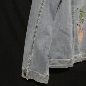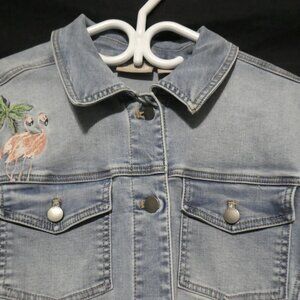 A stylish blue denim jacket featuring intricate embroidery of palm trees and flamingos