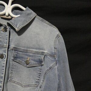 CHICO'S | size 3 | Button-Up Front Blue Denim Jacket | Flamingo Front and Back