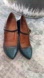 Chie Mihara Muriel Mary Jane pointy toe pumps. Three colours of leather with a forest green toe cap, grey sides and black on the back of shoes and heels. Thin Mary Jane cross strap. Style 72237. Made in Spain.