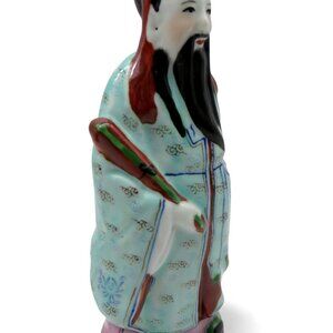 This exquisitely crafted Chinese ceramic figurine depicts a traditional immortal deity, complete with a long beard and intricate detailing.