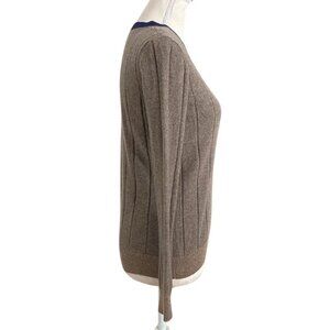 CHLOÉ STORA PARIS NAMASTE MERINO WOOL CASHMERE BLEND TAUPE KNIT NAVY GLITTERY CREW NECKLINE SWEATER PULLOVER, this is a luxurious sweater in a quality wool and cashmere blend mixing a neutral mature brown / taupe solid knit color wit ha glittery metallic navy crew neckline, same glitters are on the hemlien and cuffs yet this time ti's tone on tone for a more subtil yet as festive touch. Fall and winter favorite for a casual to business casual style - large ribbing on knit to give dimension to this classic piece.