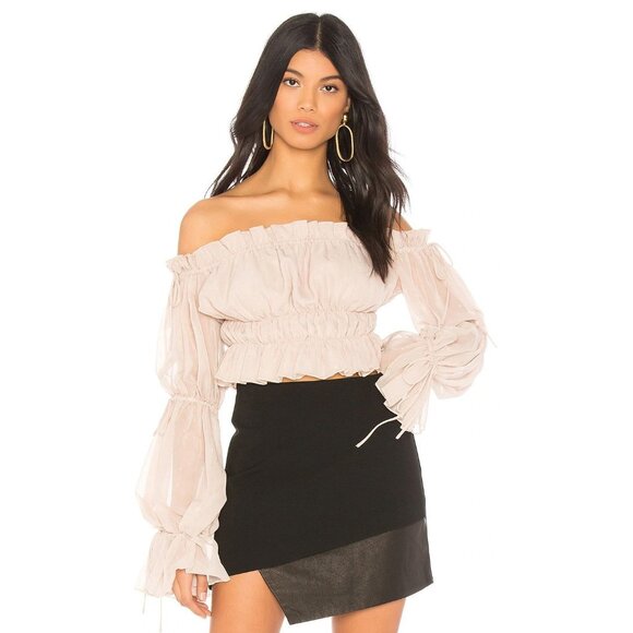 CHRISSY TEIGEN x REVOLVE Sands Nude Chiffon Ruched Off Shoulder Blouse, Size XS