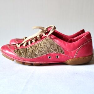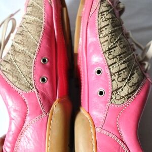Rare vintage Christian Dior pink leather monogram sneakers/running shoes. Women's size 38 with lace up closure and "D" silver-tone charm. Pink leather upper and bottom/sole with rubber treads. Sides of shoe feature brown canvas Dior monogram pattern. Ventilation holes on either side of shoes. Pre-owned but in great shape! NOTE: there is some scuffing on the leather from wear around toes and outside edges on seam (see last few pictures). Smoke-free, pet friendly home!
