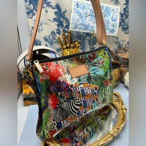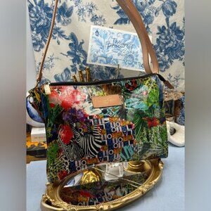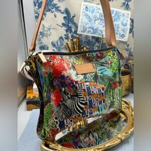 True to form, this Amazonia Print from Christian Lacroix features the beauty of the rainforest in Lacroix fashion, in the form of an adorable pouch crossbody bag. The removable leather strap makes it versatile, and the coated canvas makes it perfect for all uses!