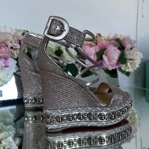 Gorgeous and comfortable metallic studded wedges. Perfect for those looking to add a little height. I feel in love with these as soon as I saw them but didn't consider just how tall they would make me with their 1 1/2" platform and 4 3/4" heel. I'm 5'7 already so these platforms are just a little to high for me. I usually wear size 39/ US 9 in Christian Louboutin but these are 38/ US 8's and they fit me perfectly because of their open toe.