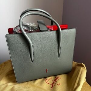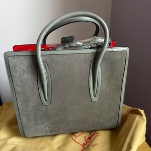 Crafted in Italy from smooth "Shadow" gray suede with tonal leather trim, Christian Louboutin's Paloma Medium tote is a chic and statement-making design that will work for day or night. The structured style is sleek and lightweight with an accordion interior that fastens using a push tab. The elegant top handles streamline to points that recall the toned legs of French cabaret dancers, while metal "heels" elevate the piece so it never has to touch the floor.