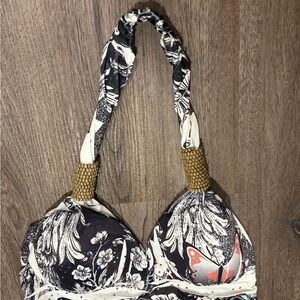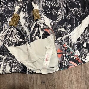 Elegant halter dress by Cristinalove. Features a striking black and white pattern. Halter neck design with gold accents, jewels (see video)