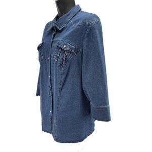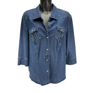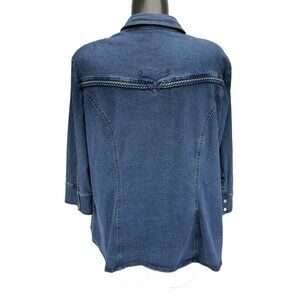 CHRISTINE LAURE Western Denim Snap Front 3/4 Sleeve Braided Trim Blue Blouse XL