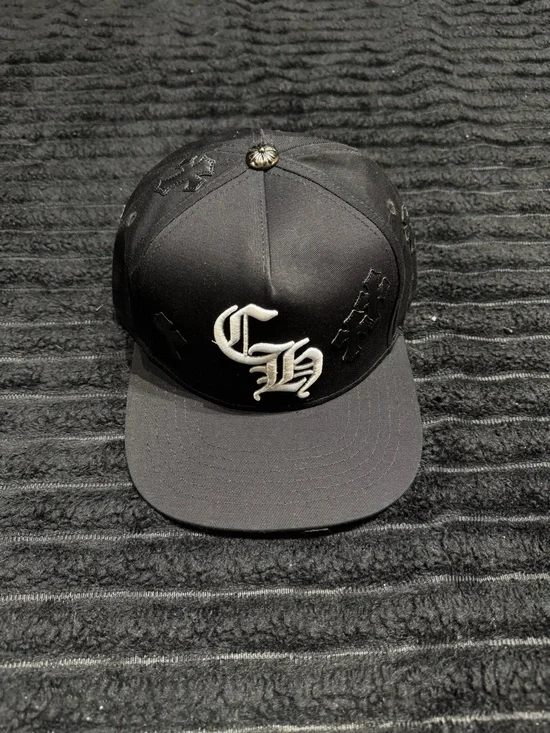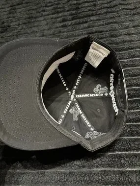 Authentic Chrome Hearts cap. Black fabric with raised black cross details. White embroidered CH logo on front. Metal top stud accent. Classic structured silhouette.