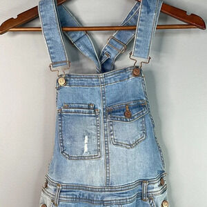 Ladies blue light wash denim jean distressed Ci Sono bibbed Overalls.