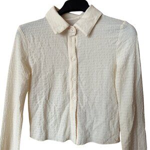 CIDER Off-White Ribbed Cropped Button Up. Collared neckline. In a cream/off white colour. Size medium and fits true to size. Can also fit as a looser small. Worn a couple of times, but in excellent condition. Tags have been cut off so there is a SLIGHT hole on the back of the neck.