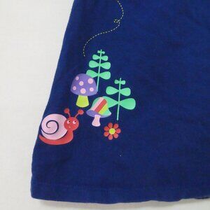 Adorable navy blue baby girl dress featuring a whimsical nature-themed print with colorful mushrooms, a cheerful snail, and a playful pink heart and flowers