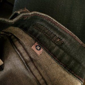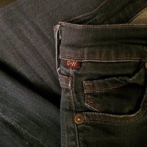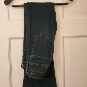 An iconic, skinny leg jean with comfortable stretch and distressed dark wash.
