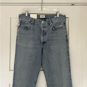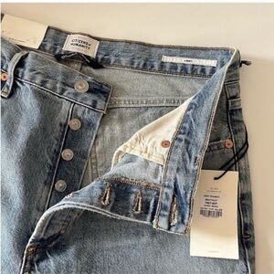 These are high-waisted bootcut jeans with a relaxed fit and full-length inseam. They're made with non-stretch 100% cotton denim. This version comes in a light indigo wash with slight whiskering and a clean hem