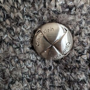This stylish Calvin Klein coat is perfect for fall and winter. Made from a warm wool blend, it features a unique double-breasted closure with eye-catching buttons, a large fold-over collar, and two front pockets. The timeless design and neutral color make it a versatile piece for any wardrobe.