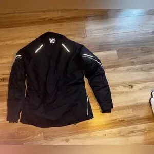 Stylish black jacket with reflective accents. Perfect for snowmobiling and outdoor activities.