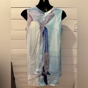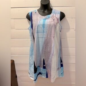 Sleeveless dress by Canadian artist Claire Desjardins, featuring a bold abstract print in shades of blue, lilac, and grey. Lightweight, airy fabric with a relaxed fit and zip closure at the back. A modern, artistic statement piece perfect for warm weather. Excellent condition.