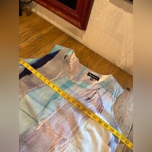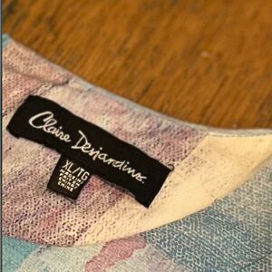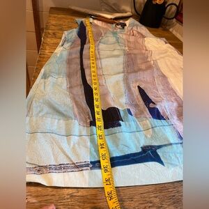 Robe sans manches signée Claire Desjardins, artiste canadienne, ornée d’un superbe imprimé abstrait dans des tons de bleu, lilas et gris. Tissu léger à la coupe ample et confortable, avec fermeture éclair au dos. Une pièce originale et artistique, idéale pour l’été. En excellente condition.