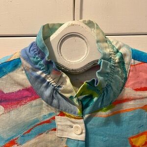 Colorful and artistic sleeveless blouse by Canadian painter and designer Claire Desjardins. Made in a soft, lightweight fabric with a ruffled collar, front buttons, and unique side button detail. A vibrant, wearable work of art.