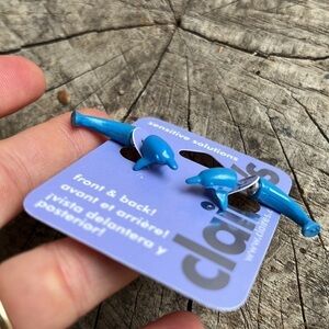 Front and back earrings from Claire’s. New. 1 set of Dolphin earrings and 1 set of Frog earrings.