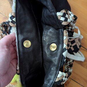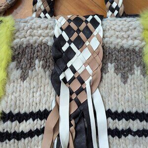 Crafted from a mix of leather, fur, and wool, this handbag boasts a striking multicolor exterior with a braided pattern that adds a touch of artisanal charm.