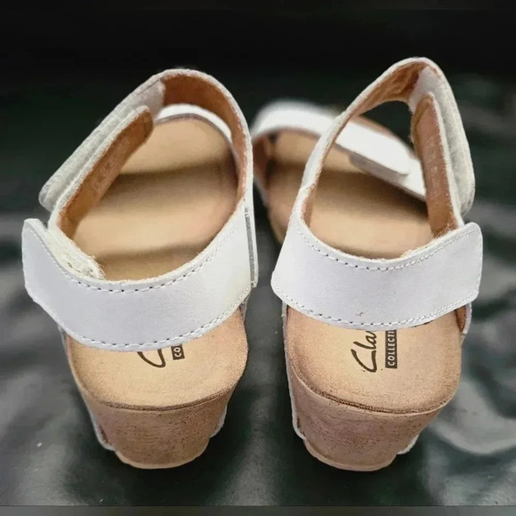 CLARKS Collection WHITE Faux Leather Strappy Platform Wedge Sandals Sz 6.5 US