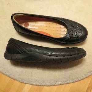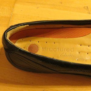 This versatile and comfortable pair of black Clarks Structured slip-on shoes is nearly-new, and comes without box. (Worn once). No visible flaws. Marked as size 7, genuine leather. Comes from a smoke-free and pet-free home.