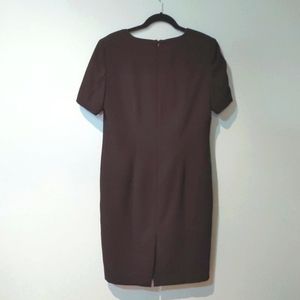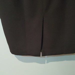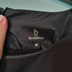 Classic black dress by Braemar is sized 10 and 100% polyester. Back has a slit and hidden zipper. 38" in length and fully lined. 19" armpit to armpit. 19.5" at hips. Measurements are approximate. Looks great with heels and a simple necklace.