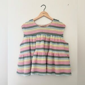 The Alina Top a ruffle tier below the neck yoke with gentle shirring and another ruffle tier. Shown here in our "Ruffle Stripe".